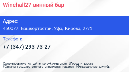 Winehall27, винный бар по адресу 450077, Башкортостан, Уфа, Кирова, 27/1 в дальнейшем Организация, размещена в следующих категориях: