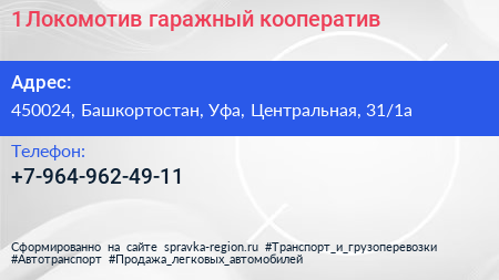 1-Локомотив, гаражный кооператив по адресу 450024, Башкортостан, Уфа, Центральная, 31/1а в дальнейшем Организация, размещена в следующих категориях: