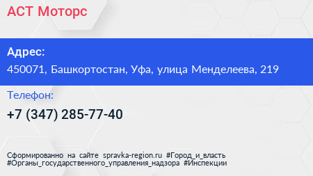 АСТ Моторс по адресу 450071, Башкортостан, Уфа, улица Менделеева, 219 в дальнейшем Организация, размещена в следующих категориях: