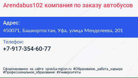 Arendabus102, компания по заказу автобусов по адресу 450071, Башкортостан, Уфа, улица Менделеева, 201 в дальнейшем Организация, размещена в следующих категориях: