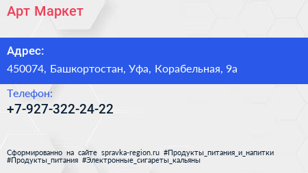 Арт-Маркет по адресу 450074, Башкортостан, Уфа, Корабельная, 9а в дальнейшем Организация, размещена в следующих категориях: