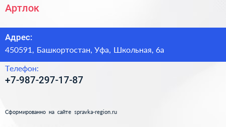 Артлок по адресу 450591, Башкортостан, Уфа, Школьная, 6а в дальнейшем Организация, размещена в следующих категориях: