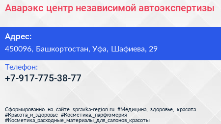 Аварэкс, центр независимой автоэкспертизы по адресу 450096, Башкортостан, Уфа, Шафиева, 29 в дальнейшем Организация, размещена в следующих категориях:
