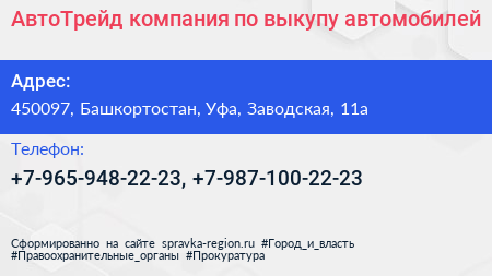 АвтоТрейд, компания по выкупу автомобилей по адресу 450097, Башкортостан, Уфа, Заводская, 11а в дальнейшем Организация, размещена в следующих категориях: