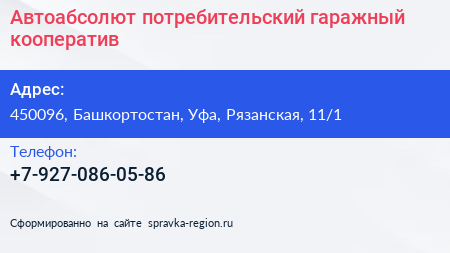 Автоабсолют, потребительский гаражный кооператив по адресу 450096, Башкортостан, Уфа, Рязанская, 11/1 в дальнейшем Организация, размещена в следующих категориях: