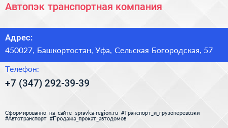 Автопэк, транспортная компания по адресу 450027, Башкортостан, Уфа, Сельская Богородская, 57 в дальнейшем Организация, размещена в следующих категориях: