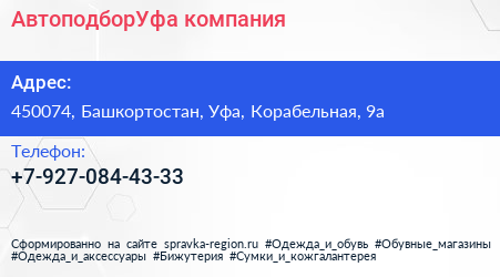 АвтоподборУфа, компания по адресу 450074, Башкортостан, Уфа, Корабельная, 9а в дальнейшем Организация, размещена в следующих категориях: