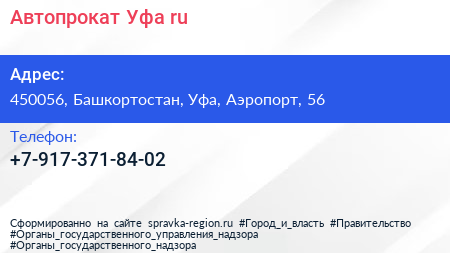 Автопрокат-Уфа.ru по адресу 450056, Башкортостан, Уфа, Аэропорт, 56 в дальнейшем Организация, размещена в следующих категориях: