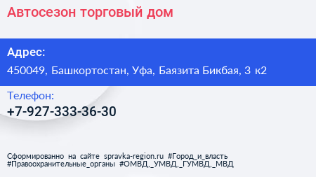 Автосезон, торговый дом по адресу 450049, Башкортостан, Уфа, Баязита Бикбая, 3 к2 в дальнейшем Организация, размещена в следующих категориях: