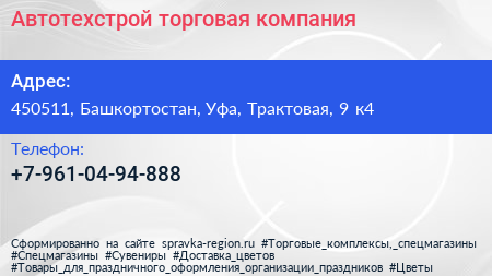 Автотехстрой, торговая компания по адресу 450511, Башкортостан, Уфа, Трактовая, 9 к4 в дальнейшем Организация, размещена в следующих категориях: