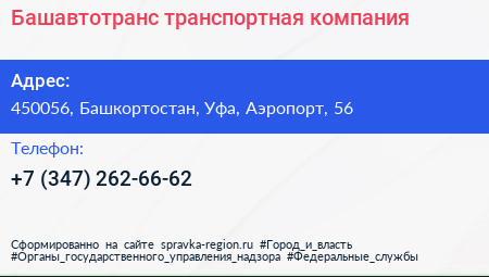 Башавтотранс, транспортная компания по адресу 450056, Башкортостан, Уфа, Аэропорт, 56 в дальнейшем Организация, размещена в следующих категориях: