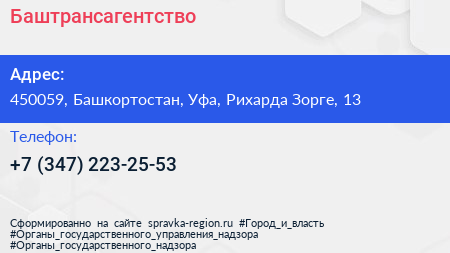 Баштрансагентство по адресу 450059, Башкортостан, Уфа, Рихарда Зорге, 13 в дальнейшем Организация, размещена в следующих категориях: