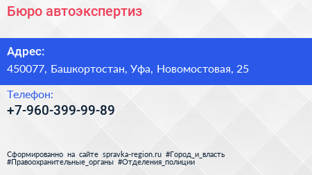 Бюро автоэкспертиз по адресу 450077, Башкортостан, Уфа, Новомостовая, 25 в дальнейшем Организация, размещена в следующих категориях: