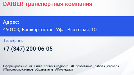 DAIBER, транспортная компания по адресу 450103, Башкортостан, Уфа, Высотная, 10 в дальнейшем Организация, размещена в следующих категориях: