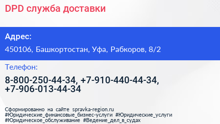 DPD, служба доставки по адресу 450106, Башкортостан, Уфа, Рабкоров, 8/2 в дальнейшем Организация, размещена в следующих категориях: