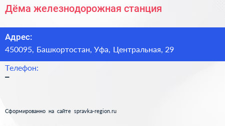 Дёма, железнодорожная станция по адресу 450095, Башкортостан, Уфа, Центральная, 29 в дальнейшем Организация, размещена в следующих категориях: