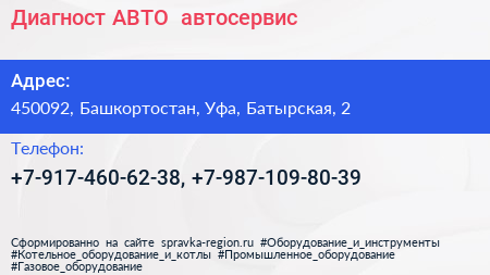 Диагност АВТО+, автосервис по адресу 450092, Башкортостан, Уфа, Батырская, 2 в дальнейшем Организация, размещена в следующих категориях: