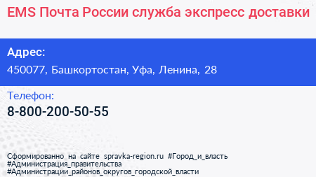 EMS Почта России, служба экспресс-доставки по адресу 450077, Башкортостан, Уфа, Ленина, 28 в дальнейшем Организация, размещена в следующих категориях: