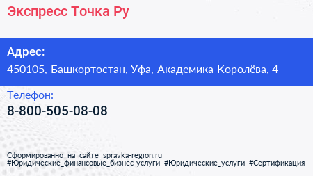 Экспресс Точка Ру по адресу 450105, Башкортостан, Уфа, Академика Королёва, 4 в дальнейшем Организация, размещена в следующих категориях: