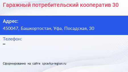 Гаражный потребительский кооператив №30 по адресу 450047, Башкортостан, Уфа, Посадская, 30 в дальнейшем Организация, размещена в следующих категориях: