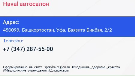 Haval, автосалон по адресу 450099, Башкортостан, Уфа, Баязита Бикбая, 2/2 в дальнейшем Организация, размещена в следующих категориях: