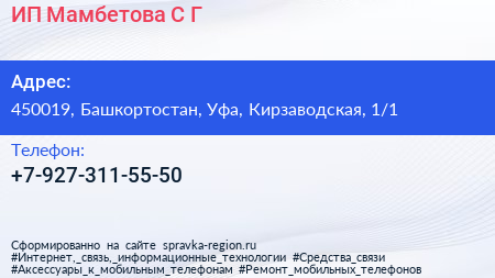ИП Мамбетова С.Г. по адресу 450019, Башкортостан, Уфа, Кирзаводская, 1/1 в дальнейшем Организация, размещена в следующих категориях: