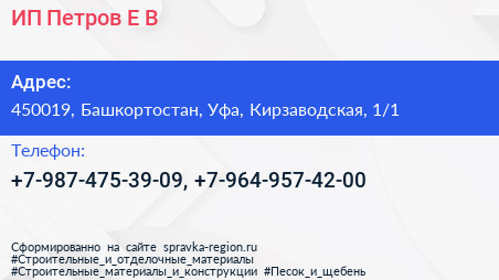ИП Петров Е.В. по адресу 450019, Башкортостан, Уфа, Кирзаводская, 1/1 в дальнейшем Организация, размещена в следующих категориях: