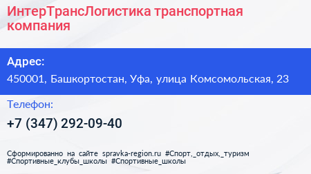 ИнтерТрансЛогистика, транспортная компания по адресу 450001, Башкортостан, Уфа, улица Комсомольская, 23 в дальнейшем Организация, размещена в следующих категориях: