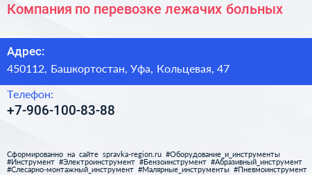 Компания по перевозке лежачих больных по адресу 450112, Башкортостан, Уфа, Кольцевая, 47 в дальнейшем Организация, размещена в следующих категориях: