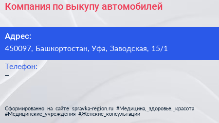 Компания по выкупу автомобилей по адресу 450097, Башкортостан, Уфа, Заводская, 15/1 в дальнейшем Организация, размещена в следующих категориях:
