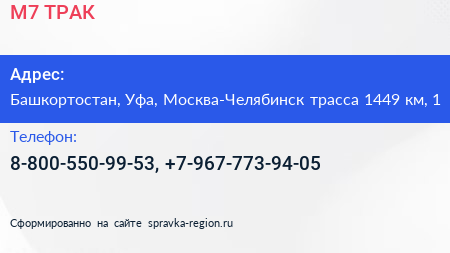 М7 ТРАК по адресу Башкортостан, Уфа, Москва-Челябинск трасса 1449 км, 1 в дальнейшем Организация, размещена в следующих категориях: