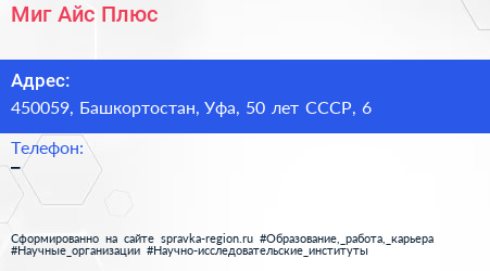 Миг-Айс Плюс по адресу 450059, Башкортостан, Уфа, 50 лет СССР, 6 в дальнейшем Организация, размещена в следующих категориях: