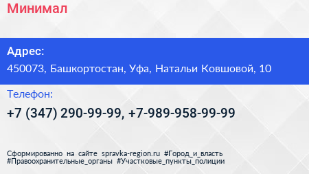Минимал по адресу 450073, Башкортостан, Уфа, Натальи Ковшовой, 10 в дальнейшем Организация, размещена в следующих категориях: