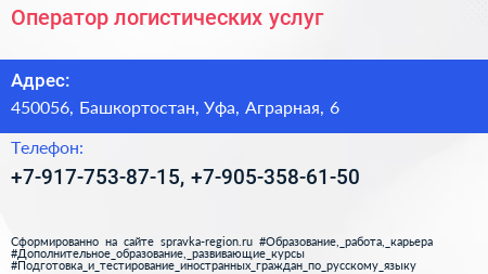 Оператор логистических услуг по адресу 450056, Башкортостан, Уфа, Аграрная, 6 в дальнейшем Организация, размещена в следующих категориях: