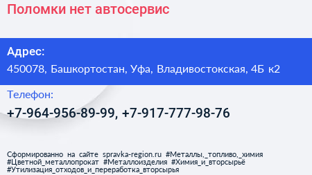 Поломки.нет, автосервис по адресу 450078, Башкортостан, Уфа, Владивостокская, 4Б к2 в дальнейшем Организация, размещена в следующих категориях: