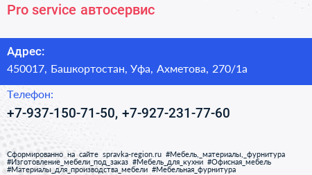 Pro-service, автосервис по адресу 450017, Башкортостан, Уфа, Ахметова, 270/1а в дальнейшем Организация, размещена в следующих категориях: