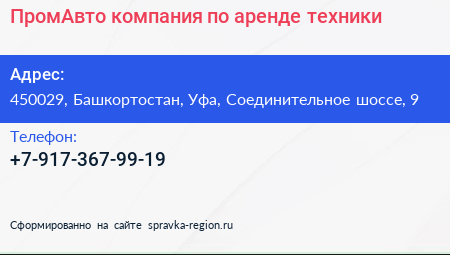 ПромАвто, компания по аренде техники по адресу 450029, Башкортостан, Уфа, Соединительное шоссе, 9 в дальнейшем Организация, размещена в следующих категориях: