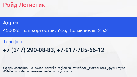 Рэйд-Логистик по адресу 450026, Башкортостан, Уфа, Трамвайная, 2 к2 в дальнейшем Организация, размещена в следующих категориях: