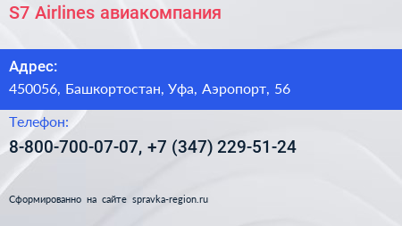 S7 Airlines, авиакомпания по адресу 450056, Башкортостан, Уфа, Аэропорт, 56 в дальнейшем Организация, размещена в следующих категориях: