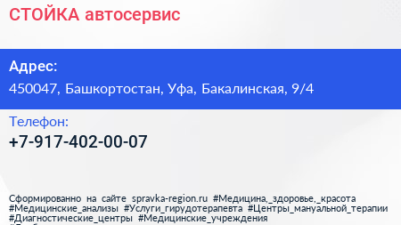 СТОЙКА, автосервис по адресу 450047, Башкортостан, Уфа, Бакалинская, 9/4 в дальнейшем Организация, размещена в следующих категориях: