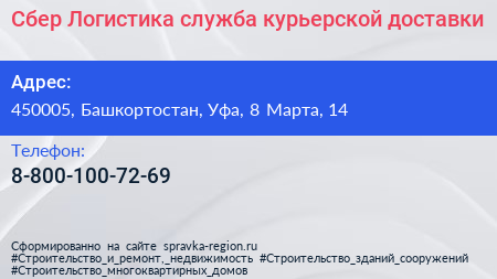 Сбер Логистика, служба курьерской доставки по адресу 450005, Башкортостан, Уфа, 8 Марта, 14 в дальнейшем Организация, размещена в следующих категориях: