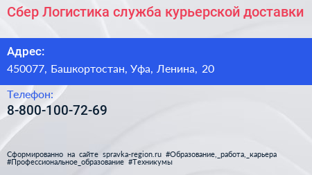 Сбер Логистика, служба курьерской доставки по адресу 450077, Башкортостан, Уфа, Ленина, 20 в дальнейшем Организация, размещена в следующих категориях: