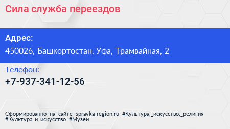 Сила, служба переездов по адресу 450026, Башкортостан, Уфа, Трамвайная, 2 в дальнейшем Организация, размещена в следующих категориях: