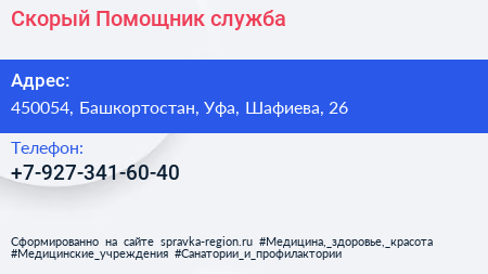 Скорый Помощник, служба по адресу 450054, Башкортостан, Уфа, Шафиева, 26 в дальнейшем Организация, размещена в следующих категориях: