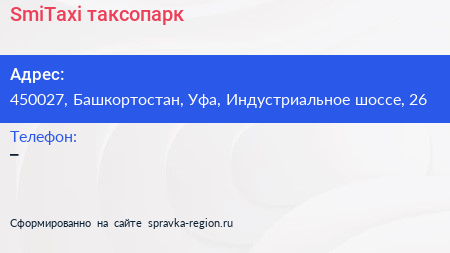 SmiTaxi, таксопарк по адресу 450027, Башкортостан, Уфа, Индустриальное шоссе, 26 в дальнейшем Организация, размещена в следующих категориях: