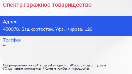 Спектр, гаражное товарищество по адресу 450078, Башкортостан, Уфа, Кирова, 126 в дальнейшем Организация, размещена в следующих категориях: