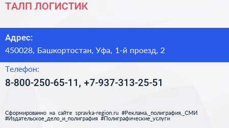 ТАЛП-ЛОГИСТИК по адресу 450028, Башкортостан, Уфа, 1-й проезд, 2 в дальнейшем Организация, размещена в следующих категориях: