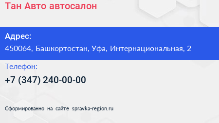 Тан-Авто, автосалон по адресу 450064, Башкортостан, Уфа, Интернациональная, 2 в дальнейшем Организация, размещена в следующих категориях: