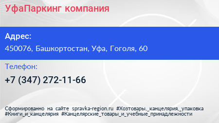 УфаПаркинг, компания по адресу 450076, Башкортостан, Уфа, Гоголя, 60 в дальнейшем Организация, размещена в следующих категориях: