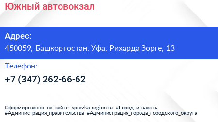 Южный, автовокзал по адресу 450059, Башкортостан, Уфа, Рихарда Зорге, 13 в дальнейшем Организация, размещена в следующих категориях: